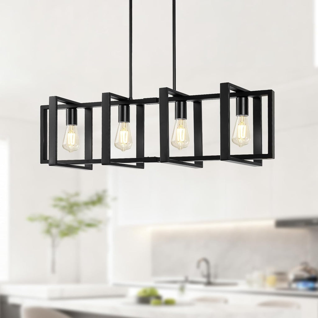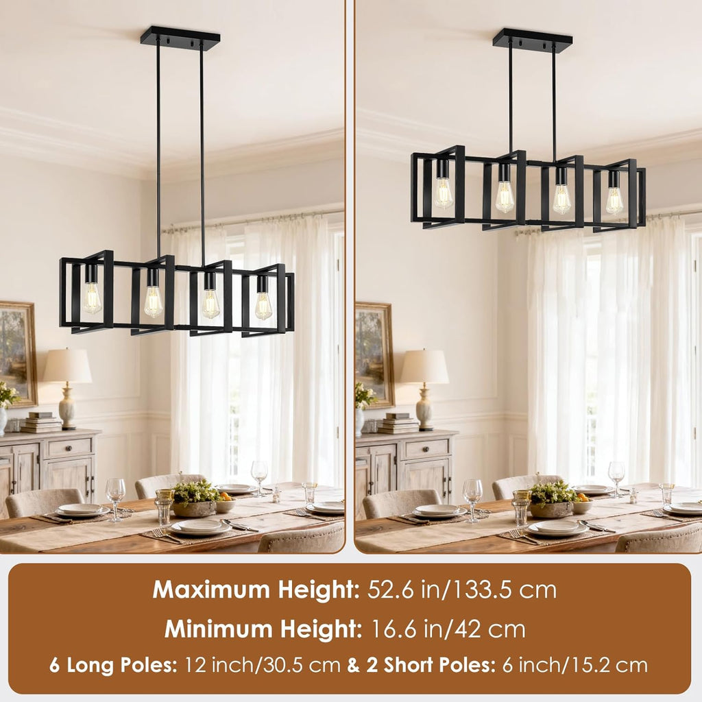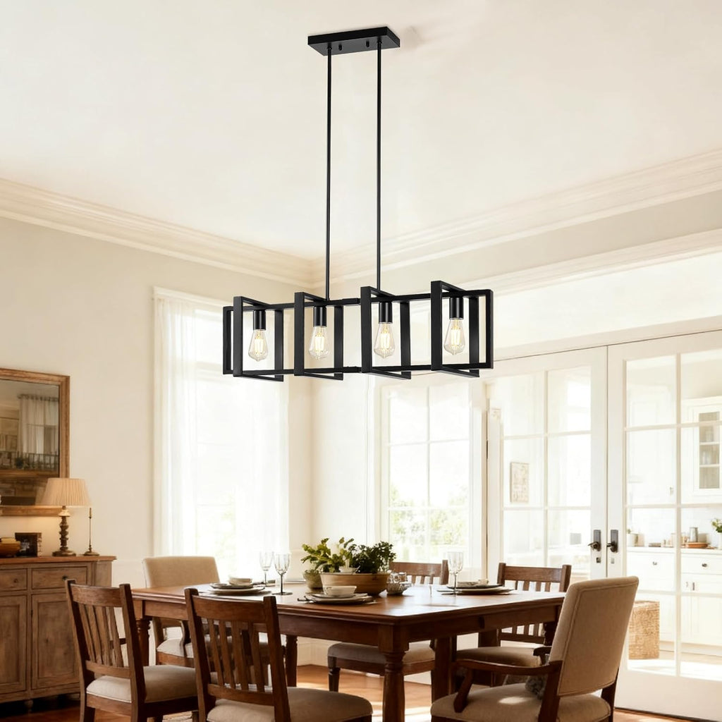 - 4-Light Modern Dining Room Light Fixture - Our farmhouse chandeliers for dining room are designed with a rectangular frame made of metal and four E26 bases, which create a brighter light. The metal part of the dining room chandelier also comes with a industrial black finish, looking simple and modern. The kitchen island lighting is a wonderful decoration and addition to your house, creating a cozy and stylish atmosphere.