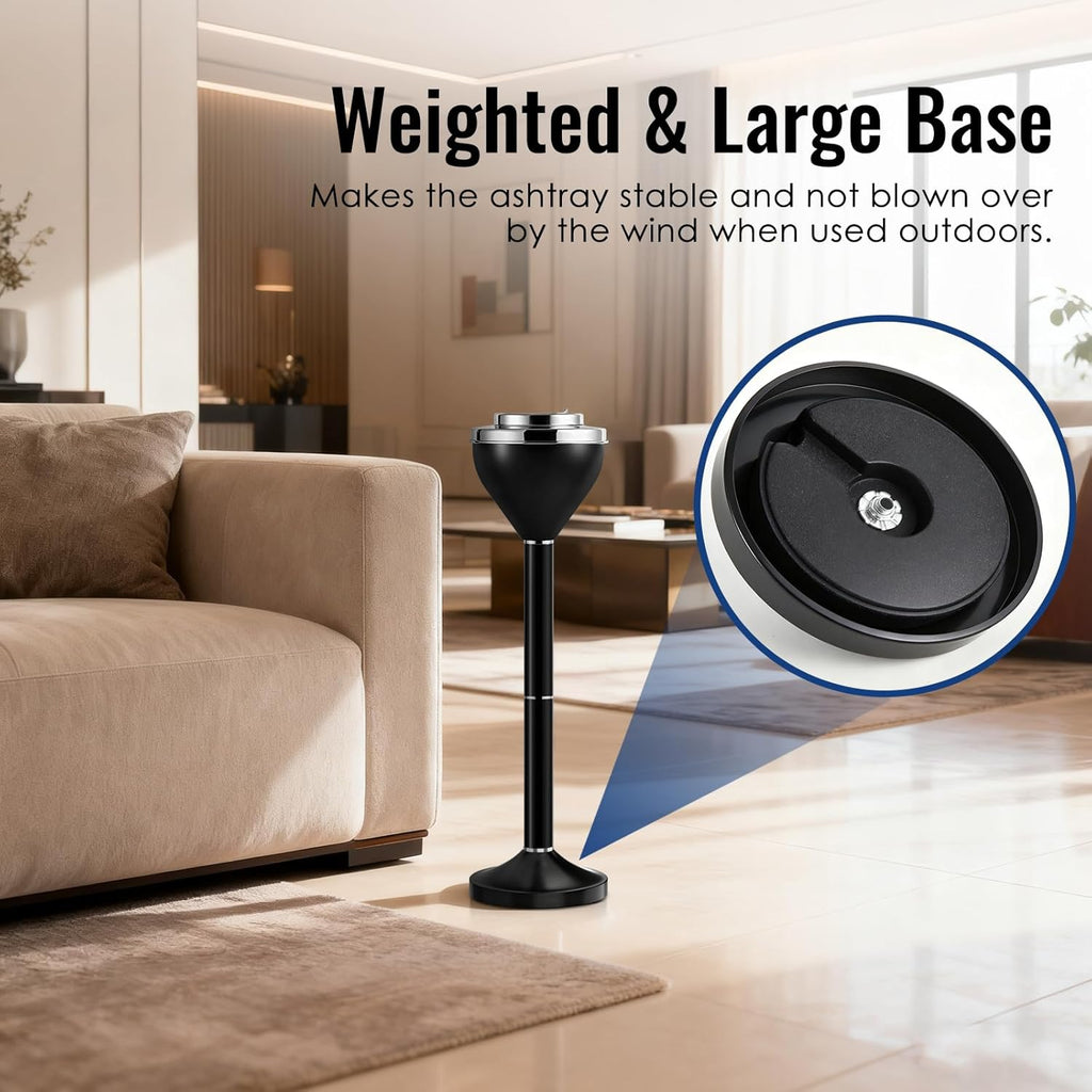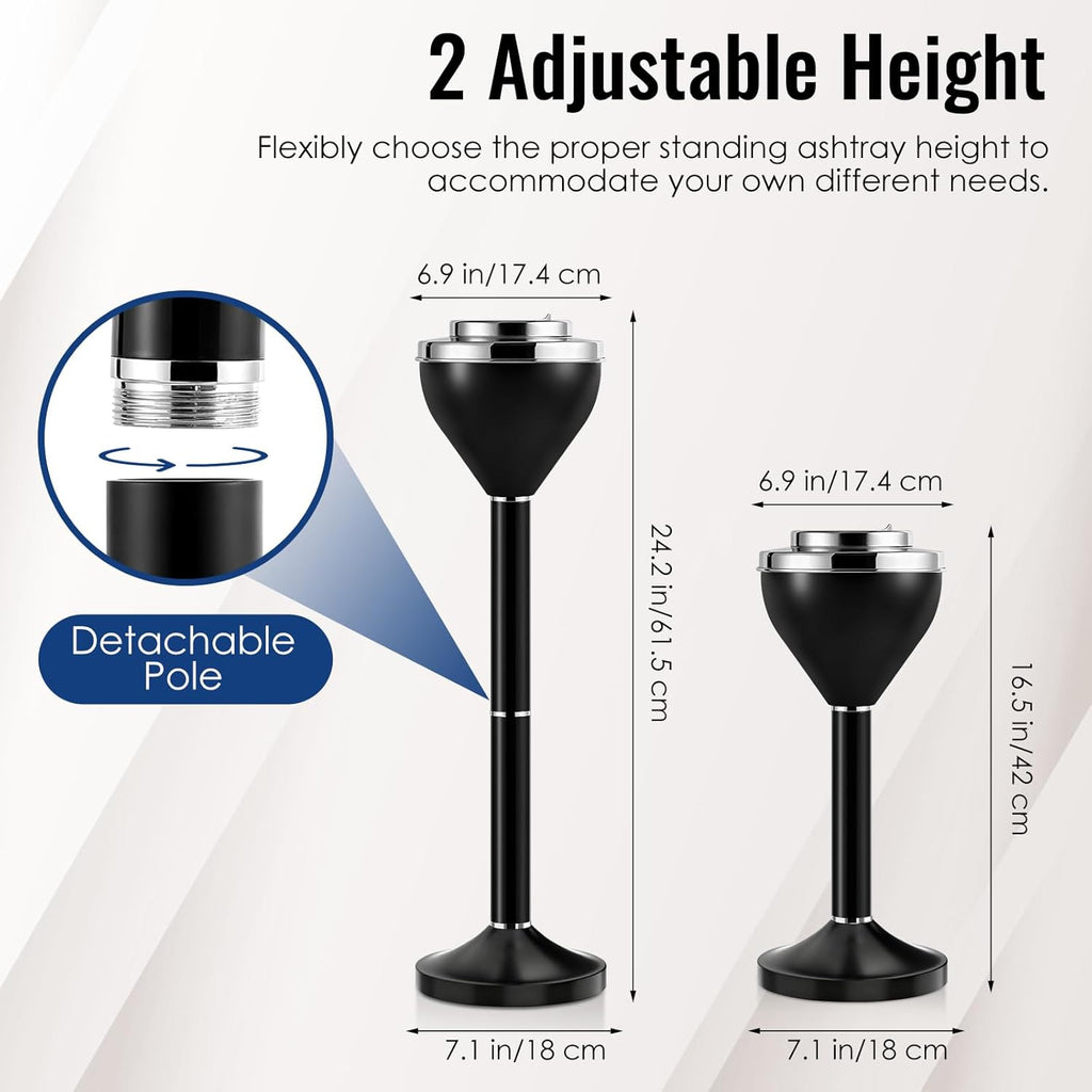 - Adjustable Ash Tray with 2 Heights - The ashtray with lid can be easily switched between two height selections to match your preferred smoking posture. The two heights of the smokeless ashtray are 16.5 in/42 cm and 24.2 in/61.5 cm. Whether near sofas indoors or seating areas outdoors, this standing ash tray delivers perfect reach and convenience in any space.