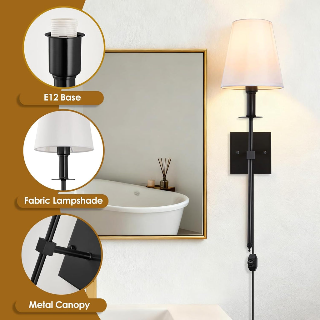 Wall Sconce, Black Wall Sconces Set of 2, Dimmable Plug in Sconces Wall Lighting, E12 Based Wall Lamp with Fabric Shade, Modern Wall Light Indoor for Bedroom Living Room Hallway Bathroom(No Bulb)