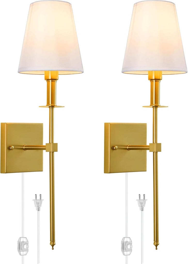 - Gold Wall Sconce with Fabric Shade - The gold painted lamp body makes the wall sconces set of 2 look modern and stylish. The fabric shade of the wall light also soften the light and avoid direct light to protect eyesight. The sconces wall lighting with fabric shade also create a warm and cozy atmosphere and is suitable for any home décor style.