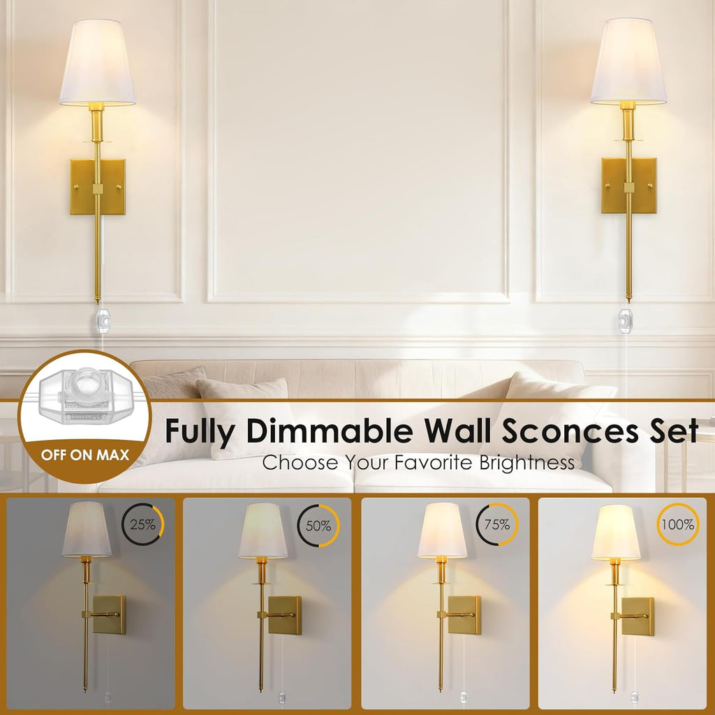 Wall Sconce, Dimmable Gold Wall Sconces Set of 2, Plug in Sconces Wall Lighting, E12 Based Wall Lamp with Fabric Shade, Classic Wall Light Indoor for Living Room Hallway Bathroom Bedroom(No Bulb)